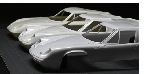 次の作業はテール周りの修正です。左の画像はヨーロッパSr.1(Type46)ではなく47GT(Type47)ですが、左側は前期型、右側はワイドになった後期型になります。しかもこの2台はかの「Team Lotus」、ロータスのワークスマシンの珍しい画像です。