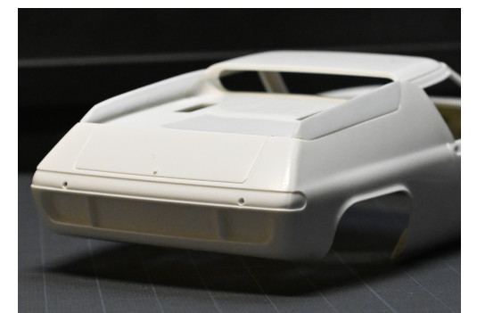 この変更のほか、塞がった状態のテールライト内側はすべて開けてメッシュのグリルにしたいのですが、この裏側にはシャーシ後端のダボピンを受けるダボ穴があり、この部分をどうするか現在思案中です。