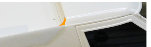 なおこれを書いている時点で、作業漏れがあることに気づきました。左の画像の通り、追加したフィンとルーフはなだらかに繋がっており、そのためには曲面状のパーツを作って接着する必要があります。(オレンジ色の部分)