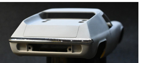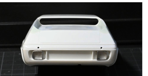 そしてパテの乾燥後に表面を均して一応完成です。さらに、フロントバンパー下側と同様にリアバンパーも角ばった部分を丸く均しておきました。