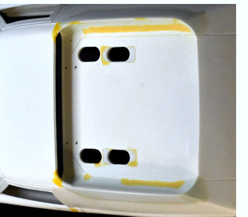 ちなみ画像は、新たにライトフレームを仕切るリブを取り付けたテール部分で、以前書いたように中央にはメッシュグリルを取り付ける予定ですが、さてエキパイをどのように配置するかも思案中です。(シャーシを固定するダボ穴があり、本来あるべきメッシュグリルの端から出せない。)