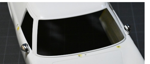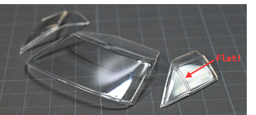 ついでにフロント/サイド一体のウインドウパーツを仮付けしてみたところ、パチピタとはいかず、特にサイドは片方をピタッと合わすと反対側にコンマ数ミリのスキ間が開いてしまうという塩梅だったので3つに分割しました。