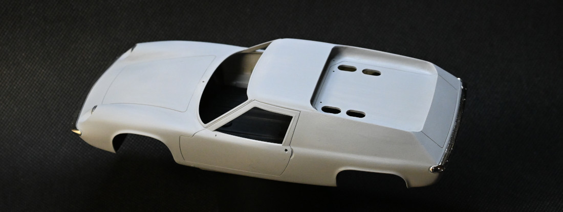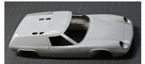今回の作業はここまで。画像にはありませんが、テール下のエキパイがでてくる溝/穴を埋めたり、左右のワイパーの穴を塞いで中央に開け直したりしています。また、フロントウインドウの四隅とサイドスクリン上の「モール止め」を削り取り(Sr.1には無い)モールも出っ張り過ぎを薄くしています。(あとはミラーの取り付け位置を決めて穴を開けなきゃ。)