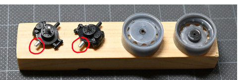 まずホイールハブ側はキットのシャフトを接着後にハブから突き出た部分を切断して中心に1mm径の穴を開けアルミシャフトを接着。ホイール側はプラリペアでいったん穴を塞いだあとに同じく1mm径の穴を開け直しました。(リア側も同様)