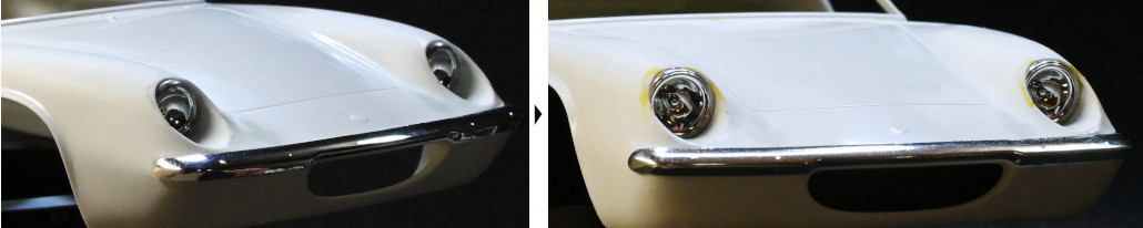 そこで、楕円状の縁の上側を拡げライトのリムの露出部を増やし、フジミのライトに置き換えたのが右側の画像です。そして追加加工した縁の部分をポリパテで均しておきました。
